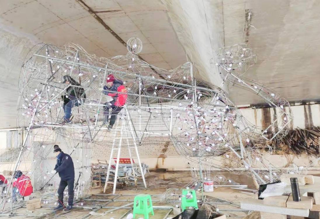 燈貿(mào)集團(tuán)燈組制作團(tuán)隊(duì)從春節(jié)前就已入駐現(xiàn)場(chǎng)。在有限的工期里,幾十名彩燈工匠全天無休,從設(shè)計(jì)、放樣、修改、手工裱糊到組裝焊接,每一個(gè)步驟都精雕細(xì)琢。