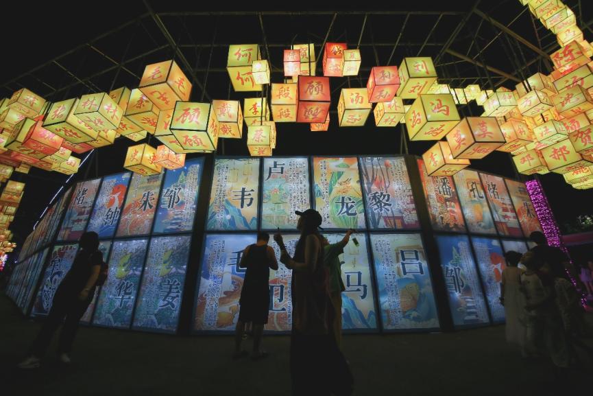本次燈會(huì)刮起濃濃“國(guó)潮風(fēng)”。燈會(huì)入口是一座中式建筑風(fēng)格的迎賓門,長(zhǎng)達(dá)50米的迎賓廊道掛滿燈籠,市民游客穿行其間,恍如置身漢唐;十二生肖彩燈俏皮靈動(dòng),精致絢爛;百余句經(jīng)典詩(shī)詞點(diǎn)亮道旁樹(shù)木;百家姓燈籠組成長(zhǎng)龍,中華傳統(tǒng)文化韻味十足。
